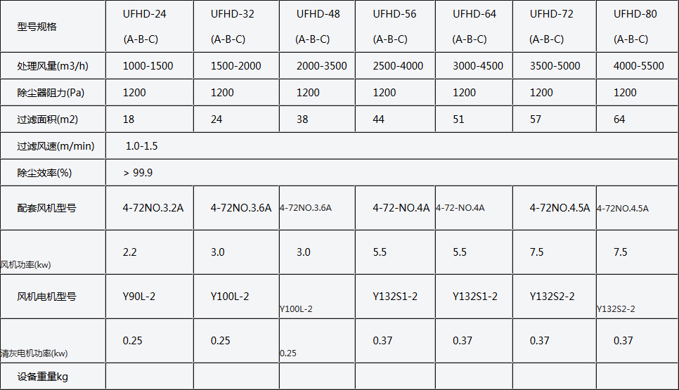 UFHD系列單機(jī)收塵器性能參數(shù)-表