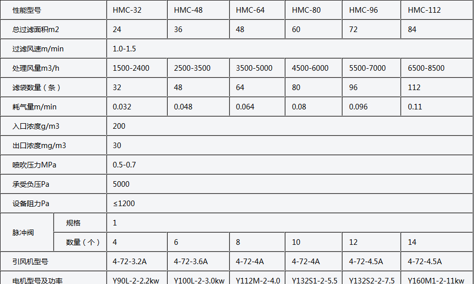 HMC單機除塵器為用戶提供了二大系列十二個規(guī)格的選型方案,每種規(guī)格可分為標(biāo)準(zhǔn)帶灰斗式A型和敞開法蘭式B型(無灰斗,適用于倉頂)二種。HMC系列單機型號區(qū)別在于濾袋數(shù),12為一組。我公司可提供24袋、32袋、48袋、64袋、72袋、80袋、96袋、112袋、120袋等各規(guī)格HMC系列設(shè)備(部分性能參數(shù)可參照下表)。我們將根據(jù)您的實際環(huán)境參數(shù),提供最佳解決方案。