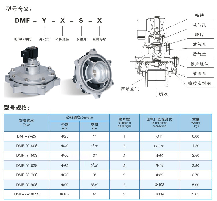 DMF-Y型電磁脈沖閥為淹沒式電磁脈沖閥(亦稱嵌入式閥),直接安裝在分氣箱上,具有更好的流通特性。壓力損失有所下降,適合于氣源壓力較低的工作場合。淹沒式電磁脈沖閥座嵌入氣包內(nèi)安裝,阻力小,流通性好,噴吹量高,提高了負荷帶動量,擴大了氣源壓力的使用范圍,此淹沒式脈沖閥更適合于氣源壓力較寬場合使用。