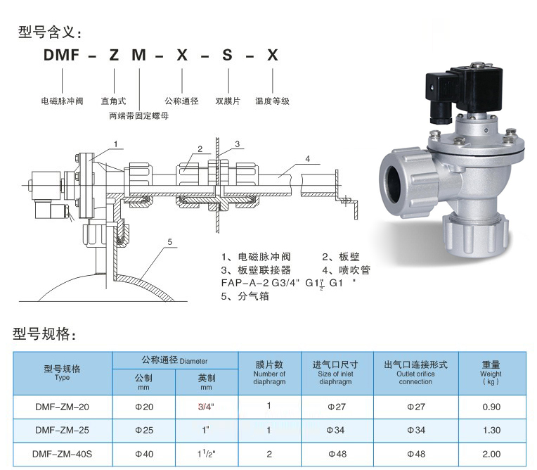 DMF-ZM型電磁脈沖閥:是與“Z”系列相同的直角閥,適用于氣包與除塵器噴吹管的安裝連接,其進(jìn)出口二端帶有安裝用的固定螺母,使安裝和使用更為方便。